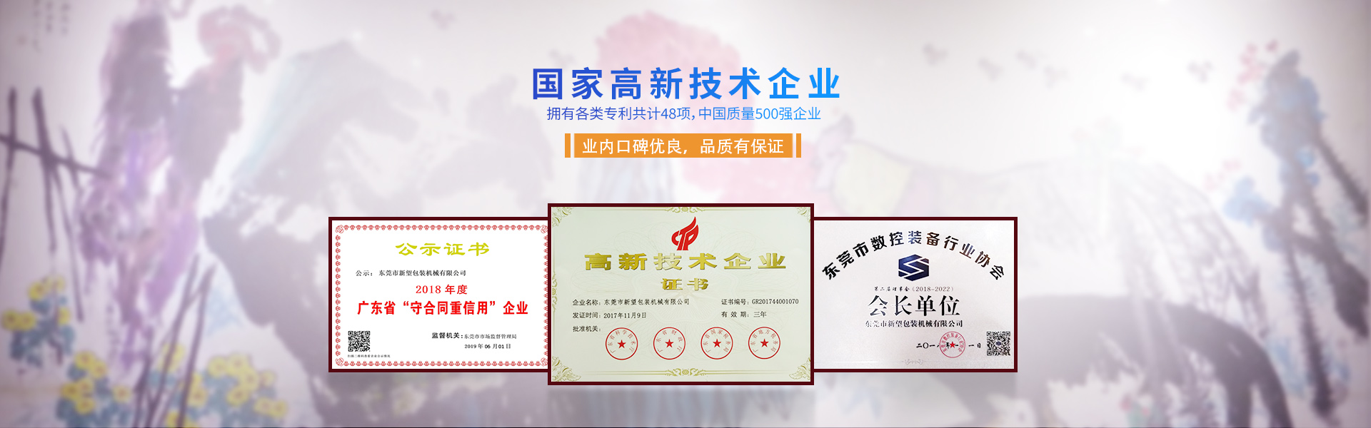 新望機械成立于1998年,位于東莞市東部工業(yè)園區(qū)的中心地帶——企石鎮(zhèn)東平村,交通方便、環(huán)境優(yōu)美舒適、視野開闊。公司注冊資本2000萬元,擁有辦公室、廠房等18,000多平方米。已通過ISO9001:2015國際質(zhì)量管理體系認(rèn)證,擁有國家各類專利共計58項。是東莞市企石鎮(zhèn)工商聯(lián)副會長單位、東莞市企石鎮(zhèn)文學(xué)藝術(shù)界聯(lián)合會副主席單位、東莞市環(huán)保包裝行業(yè)協(xié)會副會長單位、東莞市數(shù)控裝備行業(yè)協(xié)會第二屆會長單位、廣東省包裝技術(shù)協(xié)會常務(wù)理事單位、廣東省膠粘劑行業(yè)協(xié)會理事單位、廣東省著名商標(biāo)企業(yè)、國家高新技術(shù)企業(yè)。
